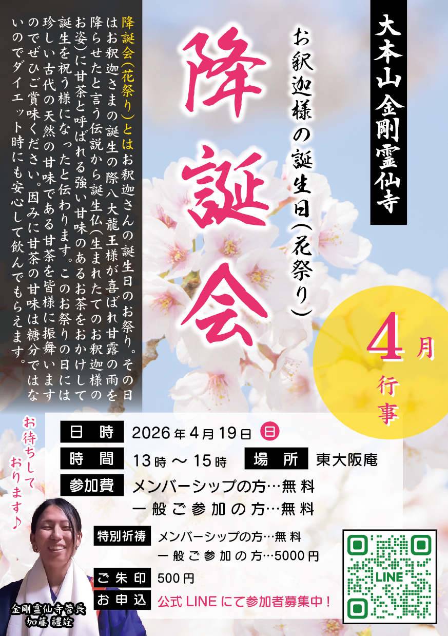 2026年4月19日のイベントのお知らせ【無料】ご参加くださいね♪ イベント 2026.04.14 月一イベント「降誕会」を開催いたします 日時…2026/04/19日曜日 時間…13時~15時くらい 場所‥東大阪の庵※詳しくはお申し込み時にLINEでお知らせします 参加費‥無料 特別祈祷…・メンバーシップの方は無料・一般ご参加の方は5,000円 参加方法‥公式LINEにて 加藤 禮詮 公式LINE